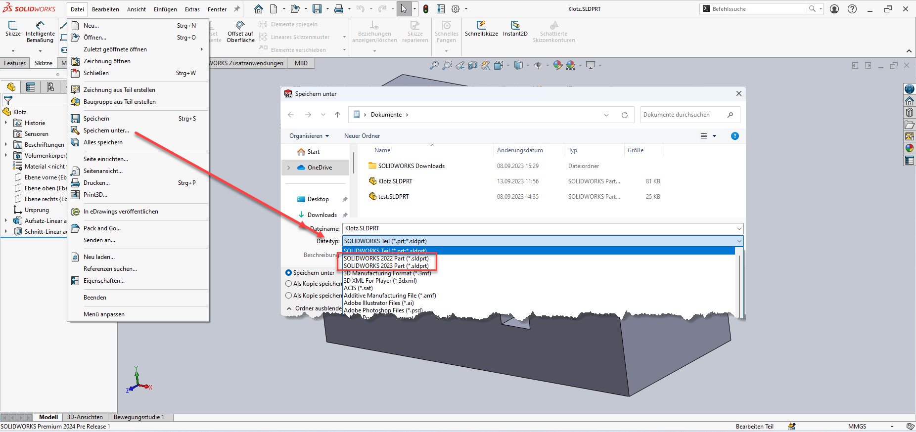 Sowohl Teile-, als auch Baugruppen- und Zeichnungsdokumente können mit SOLIDWORKS 2024 und neuer nun für ältere Versionen gespeichert werden. Im Beispiel hier anhand eines Einzelteils. Gleiches Vorgehen mit sinngemässen Masken für Baugruppen- und Zeichnungsdateien.