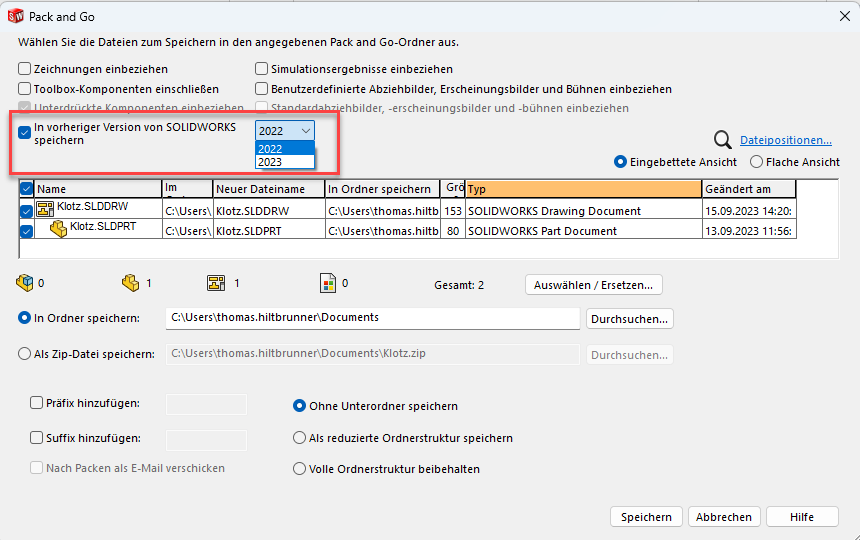 Zusätzliche, nützliche Informationen sind in der SOLIDWORKS Hilfe > SOLIDWORKS Dokumente als vorherige Versionen speichern zu finden.