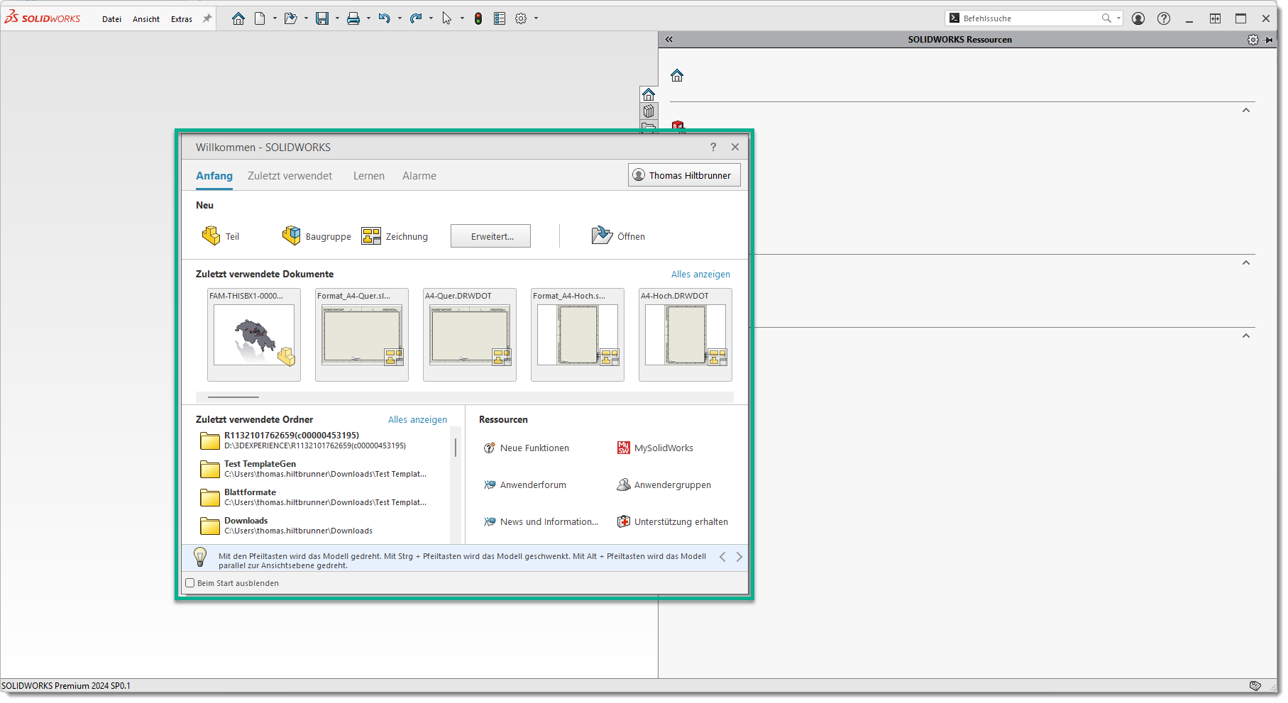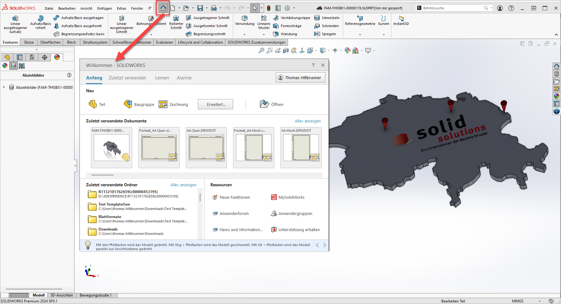 Wenn Sie SOLIDWORKS starten, erscheint standardmässig das Willkommen-SOLIDWORKS-Fenster.
