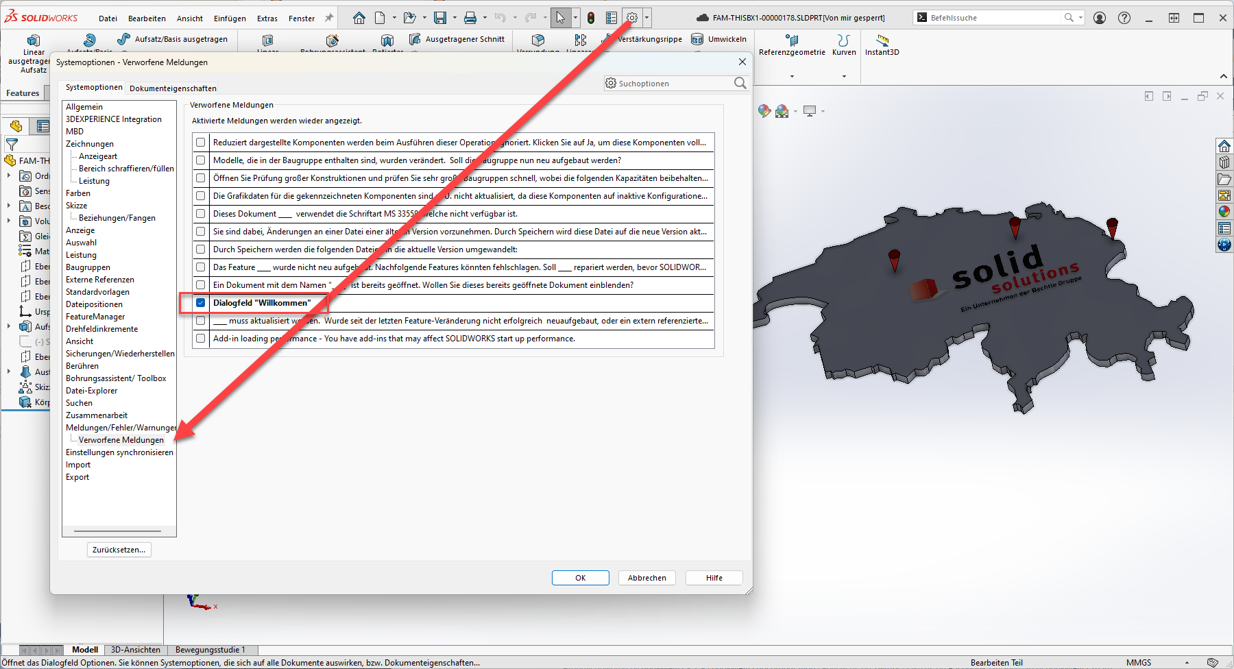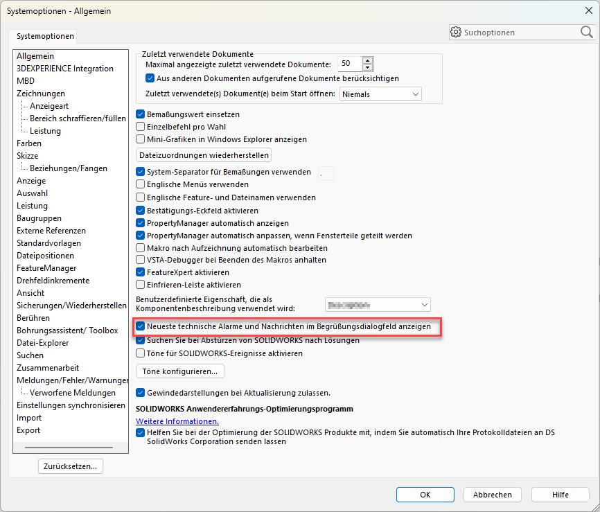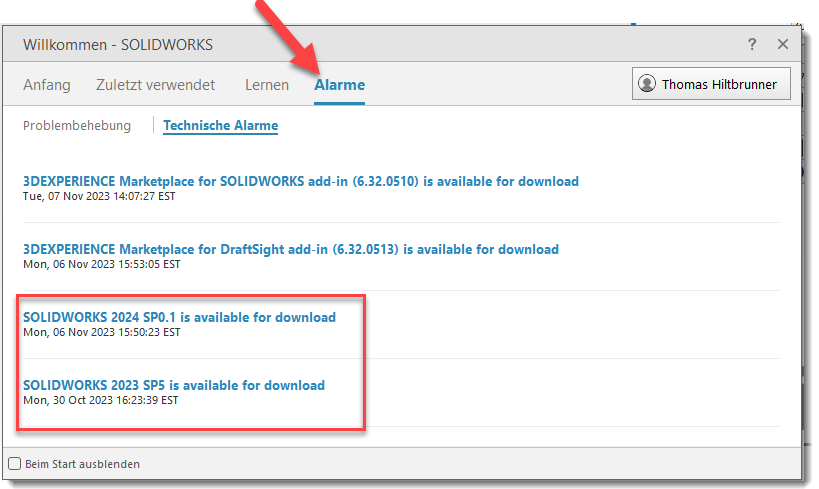 Damit die Alarme im SOLIDWORKS-Williommen-Fenter angezeigt werden, sind folgende beiden Voraussetzungen zu erfüllgen: