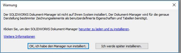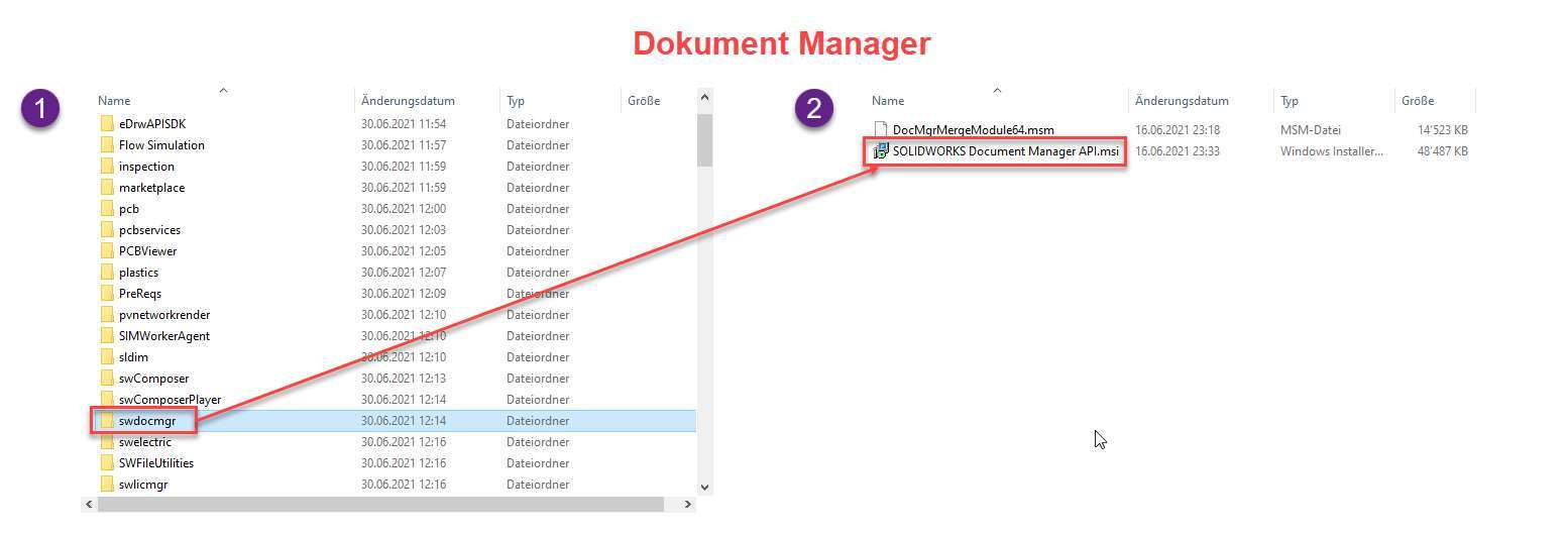 Um zu verhindern, dass die Lizenz jedes Mal neu aktiviert werden muss, brauchen Sie lediglich den SOLIDWORKS Dokument Manager zu installieren. Den Dokument Manager Installer finden Sie im Installationsverzeichnis im Ordner swdocmgr.