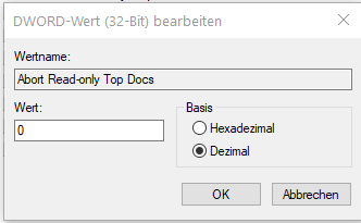 Anpassung: folgenden Registrierungsschlüssel anpassen unter HKCU\Software\SolidWorks\SolidWorks 20XX\Collab\Abort Read-only Top Docs. Doppelklicken Sie auf den Wertnamen, und ändern Sie die Wertdaten in 1