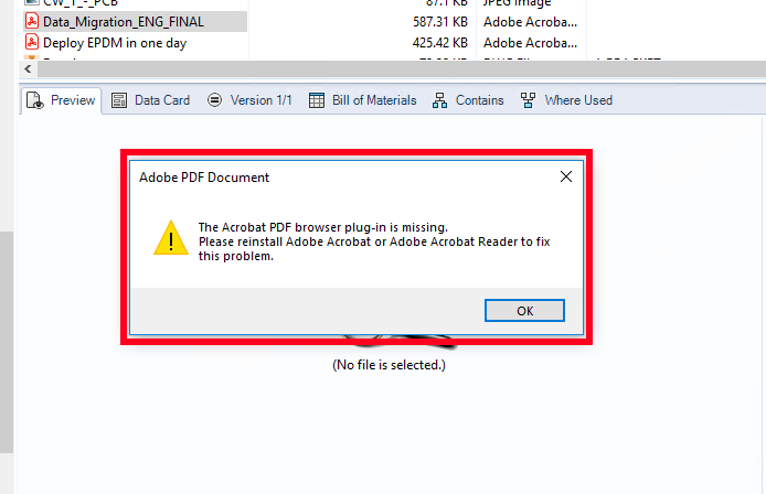 1. Bei ausgewählter Vorschau in SOLIDWORKS PDM und Anwahl einer PDF erscheint eine Fehlermeldung.