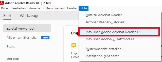 2) Hilfe > Info über Adobe Acrobat Reader DC