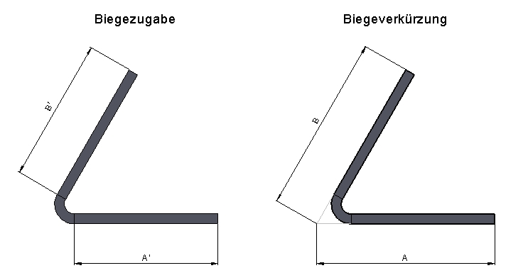 Grundsätzlich unterscheiden sich die Verfahren Biegezugabe und Biegeverkürzung darin, dass bei der Biegezugabe die Länge der unverformten Schenkel zugrunde liegen und mit dem Wert BA die Grösse der abgewickelten Biegezone hinzugerechnet wird. Bei der Biegeverkürzung werden die Schenkellängen bezogen auf den theoretischen Schnittpunkt der beiden Schenkel zugrunde gelegt und für die Beigezone ein Verkürzungswert abgezogen. Es handelt sich also um verschiedenartige Modellierverfahren. Die Rechnung mit dem k-Faktor ist eine Variante der Biegezugabeberechnung. Auch hier sind die unverformten Schenkellängen entscheidend, die Breite der Biegezone ist aber kein vorgegebener Wert, sondern errechnet sich als Bogenlänge der neutralen Fase. Die verschiedenen Rechnungsverfahren lassen sich aber mathematisch ineinander überführen.