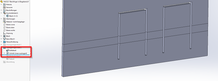 Oft müssen Blechlaschen/Zungen aus einer Biegung herausragen. In nachfolgender Grafik betrifft dies exemplarisch die beiden äusseren Laschen. Wie kann dies realisiert werden? Die folgende Anleitung zeigt Ihnen das Grundverhalten von SOLIDWORKS, sowie zwei Lösungsansätze.