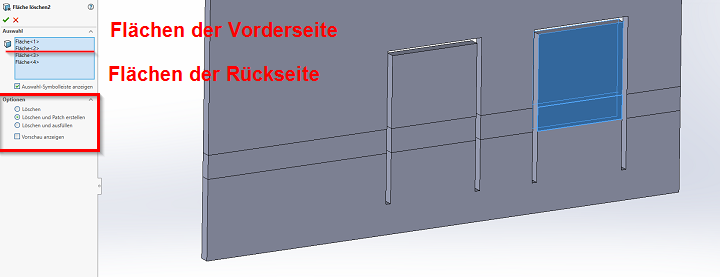 Damit aber die Lasche nicht zurückgebogen wird, müssen die Biegebereiche entfernt werden. Dies kann mittels Funktion "Fläche löschen" (Menü Einfügen > Fläche > Löschen) erfoglen. Dieser Befehl kann auch auf der Fläche selbst via rechter Maustaste aufgerufen werden. Wählen Sie dabei nicht nur die Flächen der Vorderseite, sondern deren Pendant auf der Rückseite. Die Optionen sind der nachfolgenden Abbildung zu entnehmen.