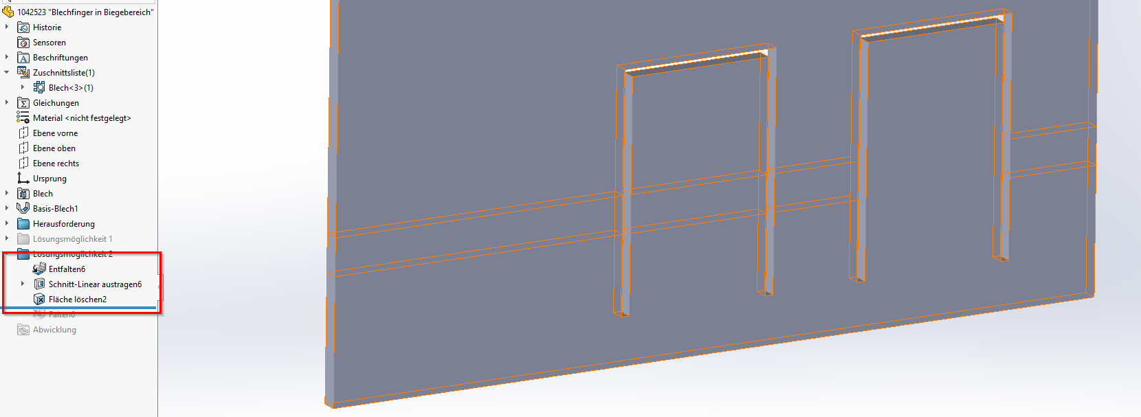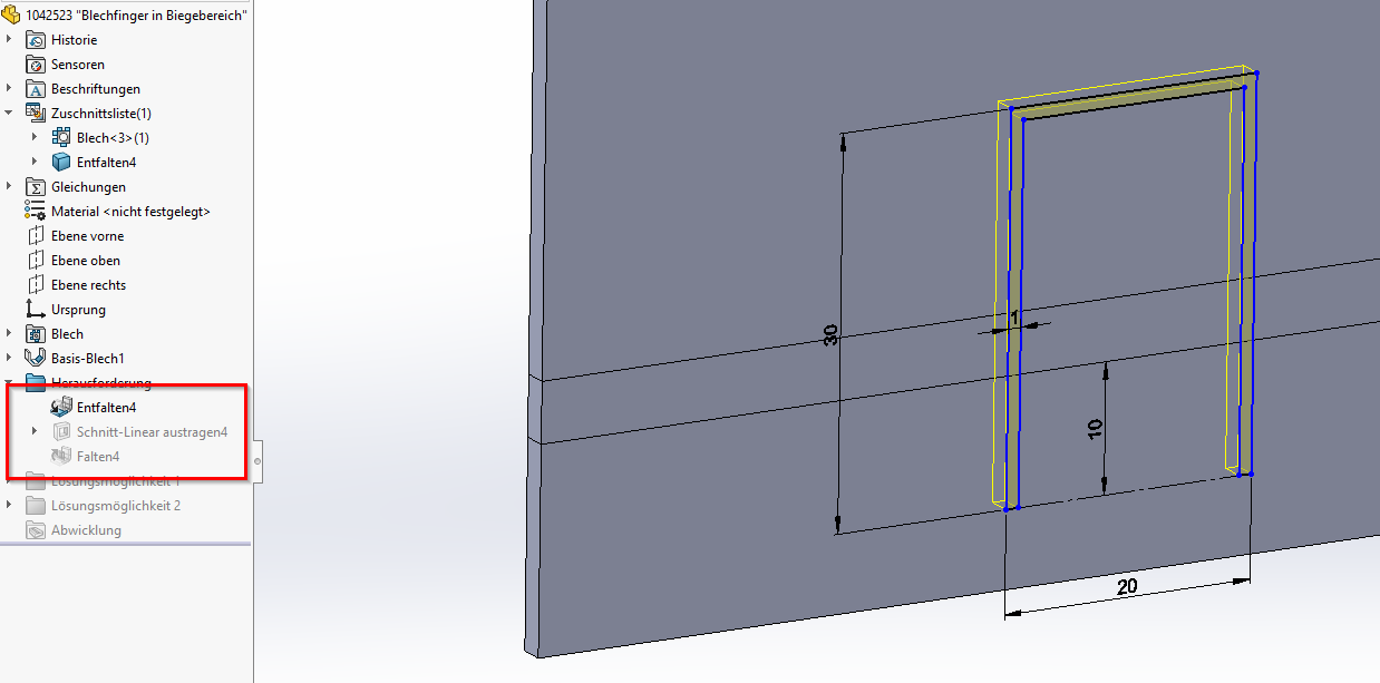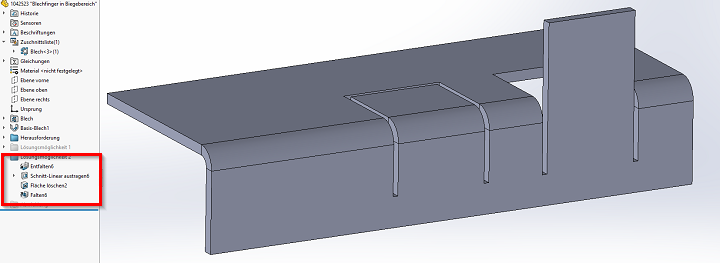 Das Blech wird wird entfaltet (nicht abgewickelt). Auf dem flachem Blech wird ein U-förmiger Ausschnitt erstellt. Exakt dem Vorgehen des Grundverhaltens zu Beginn dieses Beitrags.
