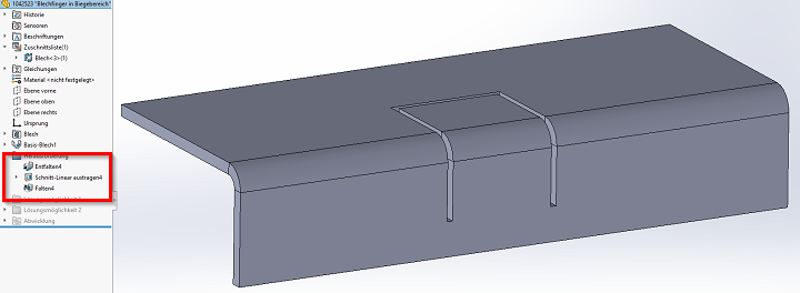 Wird die Kontur durch das Blech geschnitten und das Falten-Feature hinzugefügt, wird der gesamte Biegebereich genutzt. Somit wird auch die freigestellte Lasche zurückgebogen. Es gibt dabei keine Option zur Definition der Biegebreiche. Das in dieser Situation unerwünschte Resultat sieht wie folgt aus: