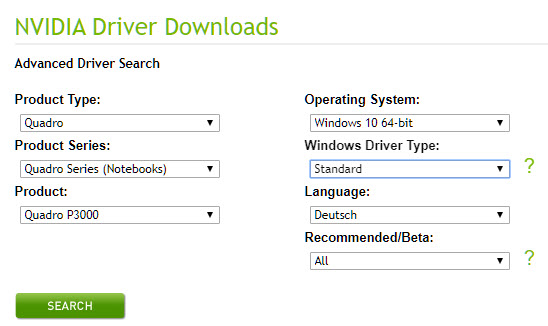 Hier muss aktuell die Grafikkarte nochmals ausgewählt werden. Die Notebook und Workstation-Grafikkarten sind in einem eigenen Bereich (Product Series) gelistet. Weitere Informationen zum Windows-Treiber-Typ (Standard / DCH) finden Sie in diesem Blogbeitrag von Nvidia.