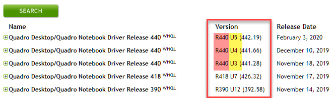 SOLIDWORKS empfiehlt aus dem Branch, in diesem Beispielfall der R440, den neusten Treiber zu installieren. Je höher die gelb markierte Zahl, umso neuer der Treiber. Dies widerspiegelt auch die in (Klammern) dargestellte Nummer.