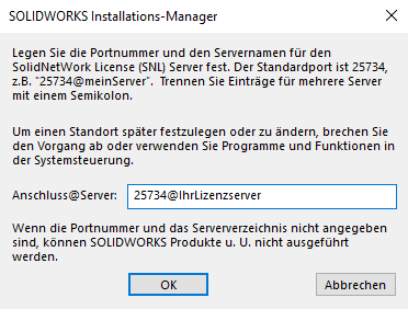 Wenn die Seriennummer auf eine Netzwerklizenz (9010* / 0010* geändert wird, muss im Folgeschritt der Lizenzserver inkl. Port-Nummer (25734@Servername) angegeben werden.