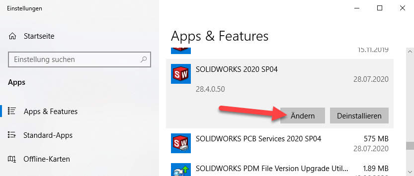- SOLIDWORKS anwählen und ändern starten