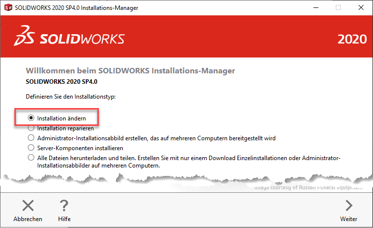 Wählen Sie in der darauf erscheinenden Maske des SOLIDWORKS Installations-Manager ebenfalls die Option Installation ändern. In älteren SOLIDWORKS Versionen hiess diese Option: Einzelplatzinstallation (auf diesem Computer) ändern.