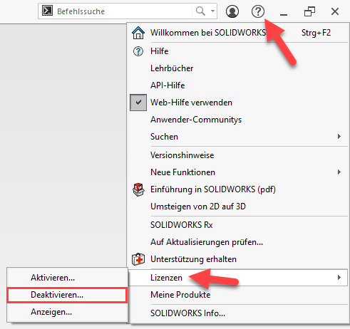 - Bis und mit SOLIDWORKS 2020 SP3.0 Deaktivierung via Hilfe-Menü