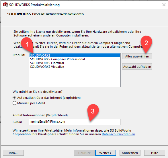 Die Deaktivierung der SOLIDWORKS CAD Lizenz kann und muss durch Sie, den Anwender erfolgen. Der Support/die Hotline kann die Lizenz für Sie nicht zurückgeben.