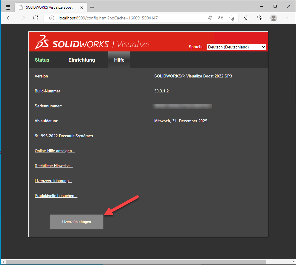 Die Lizenz von SOLIDWORKS Visualize Boost kann und muss durch Sie, den Anwender erfolgen. Der Support/die Hotline kann die Lizenz für Sie nicht zurückgeben.