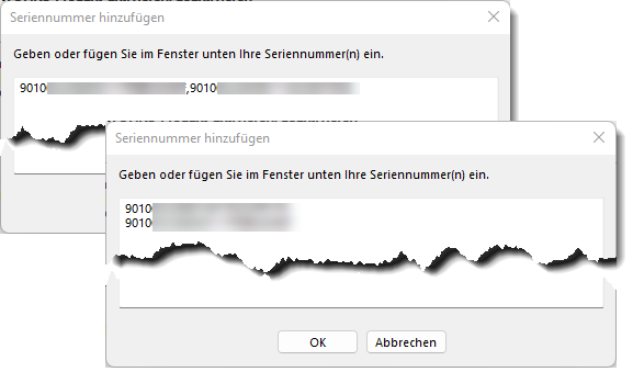 - Einzeilig, Seriennummern getrennt durch ein Komma (,)