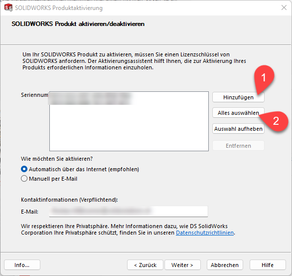 Nach dem Ergänzen der Seriennummern wählen Sie alles auswählen (2) und führen den Dialog per Weiter zu Ende.