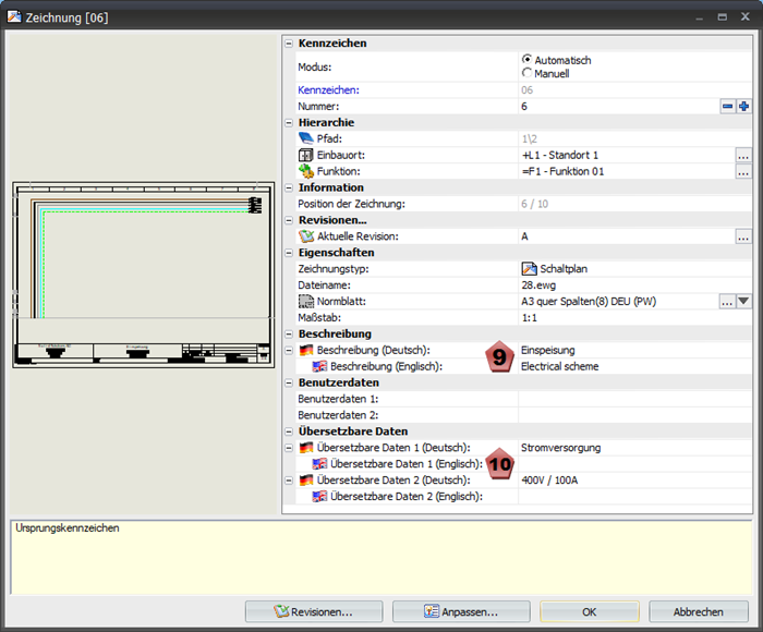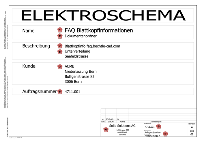 SOLIDWORKS Electrical Schematic stellt vorbereitete Schemablätter zur Verfügung. Diese Schemablätter weisen eine Vielzahl von Attributen auf. Welches Attribut, sprich welche Blattkopfzelle wird durch welche Eigenschaft befüllt. Nachfolgende Anleitung zeigt die Aufschlüsselung. Dabei kommen Eigenschaften vom Projekt, von Buch, von Ordnern und die Blatteigenschaften selbst zum Zuge.