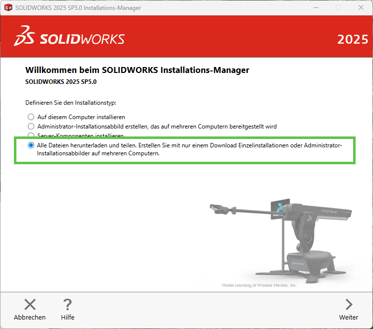 Nach erfolgreichem Entpacken des Installations-Managers, startet dieser sich automatisch selbst. Ist der SOLIDWORKS Installations-Manager gestartet, wählen Sie die letzte der angebotenen Optionen aus: Alle Dateien herunterladen und teilen. Klicken Sie anschliessend auf Weiter.