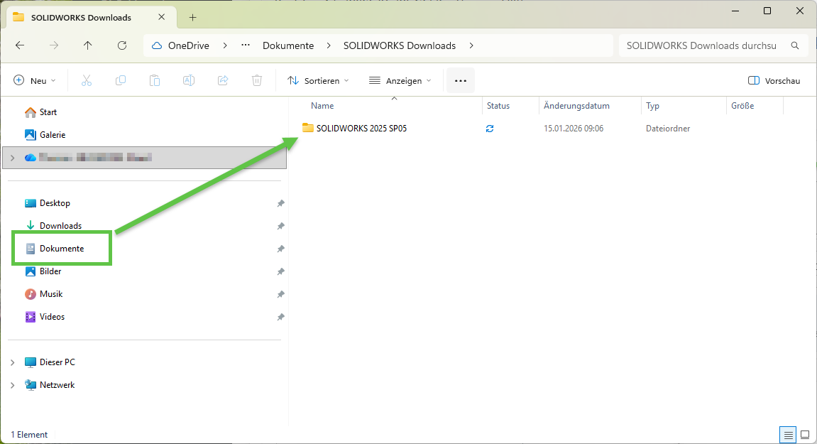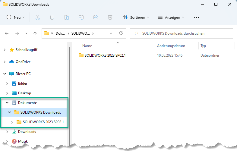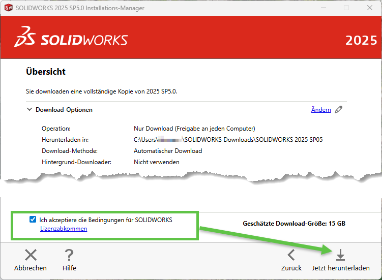 Der SOLIDWORKS Installations-Manager beginnt jetzt mit dem kompletten Download. Standardmässig wird dieser in Ihrem Dokumenten-Ordner von Windows abgespeichert.