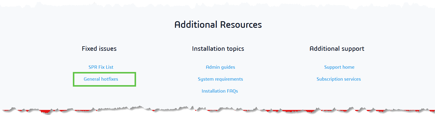 Scrollen Sie bis vor den roten Bereich am unteren Ende der Webseite, finden Sie den Abschnitt Additional Resources. Hier haben Sie nicht nur direkten Zugriff auf die Administrations und Installationshandbücher (Admin guides), sondern auch auf eine Liste verfügbarer und zur zusätzlichen Installation empfohlener Hotfixes (General hotfixes).