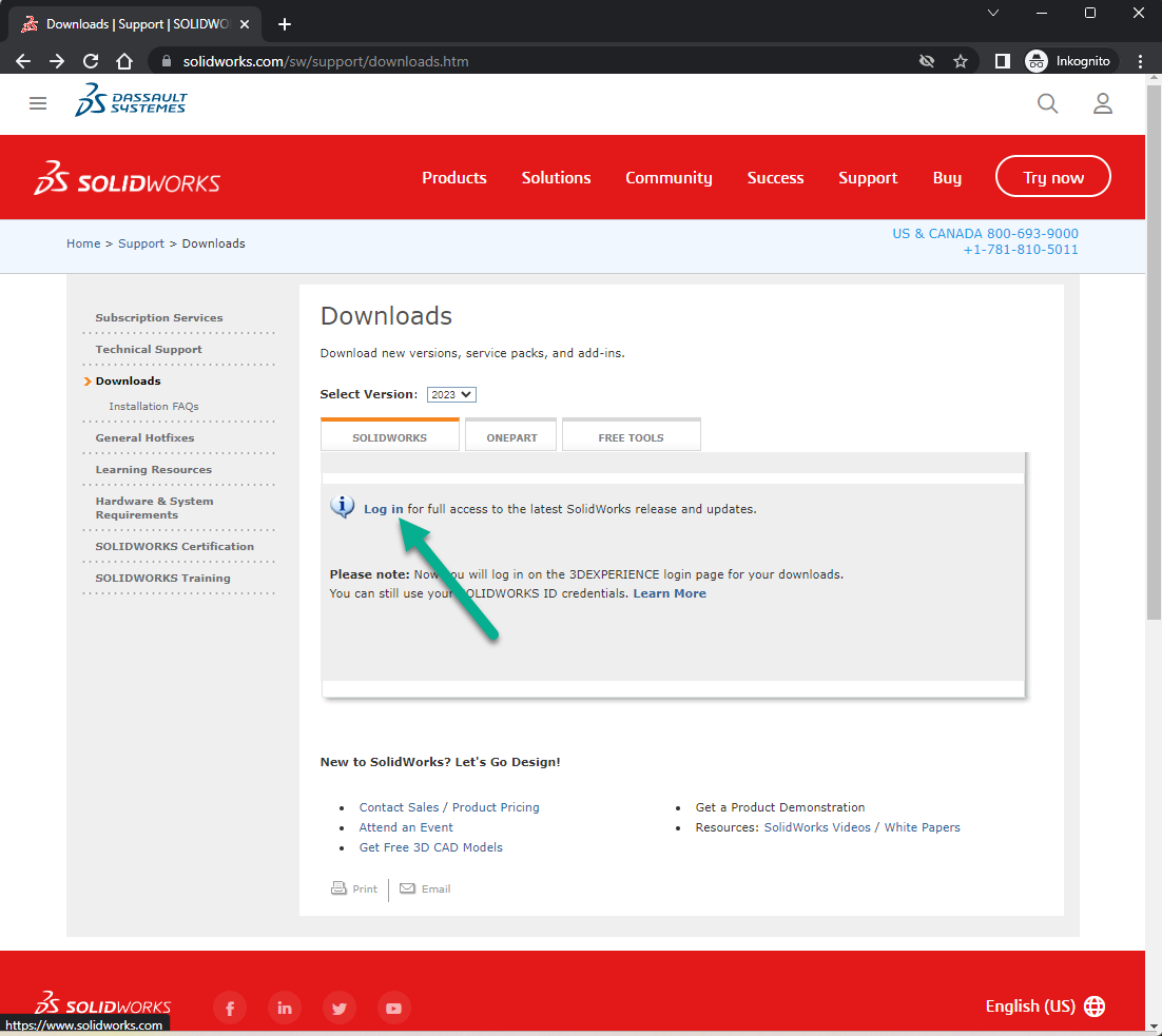 Starten Sie für den Download auf www.solidworks.com. Scrollen Sie ganz ans untere Ende der Seite. Hier finden Sie einen Link Downloads. Klicken Sie darauf.