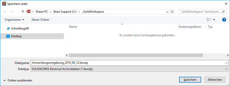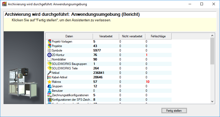 Es wird dringend empfohlen, nach dem Konfigurieren von Vorlagen und Einstellungen in SOLIDWORKS Electrical und anschliessend in regelmässigen Abständen ein Umfeldarchiv zu erstellen.
