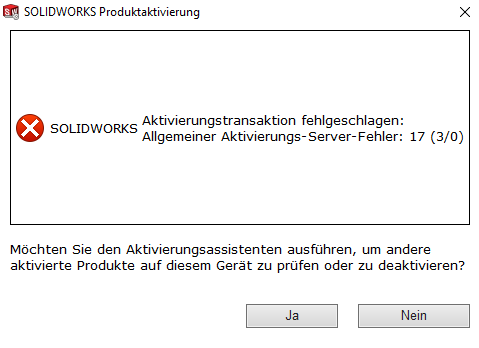 Die auf den Text "Allgemeiner Aktivierungs-Server-Fehler:" folgende Zahl muss nicht zwingend 17 lauten. Diese Zahl widerspiegelt die von Ihnen gestartete Version von SOLIDWORKS.